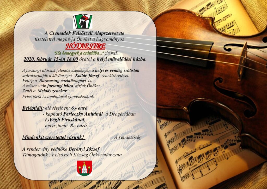 A Csemadok Felsőszeli Alapszervezete már 35 éve szervezi a farsangi Nótaestet, melynek lényege a helyi népdal- és nótaénekesek bemutatkozása, a magyar nóta átadása a további generációknak. A farsang nálunk már elképzelhetetlen a hagyományos Nótaest nélkül. A felsőszeli szólistákon kívül mindig van vendég is a környező falvakból. A Rozmaring éneklőcsoport is színesíti fellépésével az estet. A nótásokat Kotlár József zenekara kíséri.