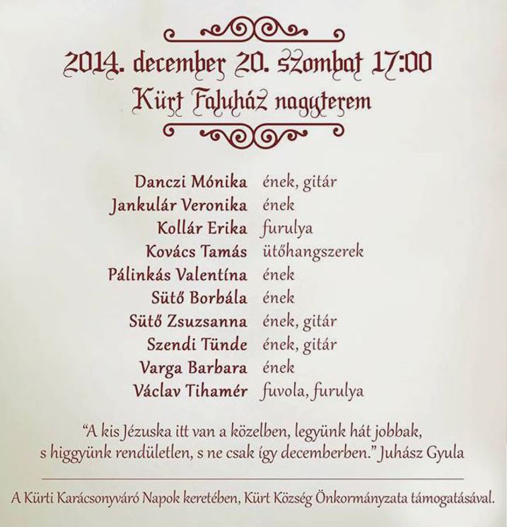 Első alkalommal kerül sorra karácsonyi tematikájú koncertünk a Kürti Faluház nagytermében. A koncertről hangfelvétel készül. A belépés ingyenes. Mindez 2014. december 20-án, szombaton, 17.00 órakor. Elhangzanak saját szerzemények és megzenésített versek.