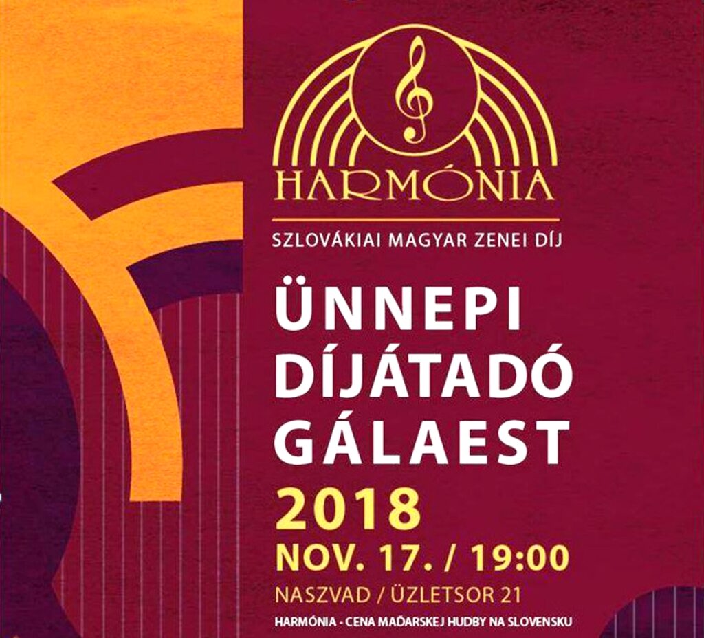 A Harmónia Szlovákiai Magyar Zenei Díj Polgári Társulás nevében nagy tisztelettel és szeretettel meghívjuk a 2018. november 17-én, szombaton 19.00 órakor Naszvadon rendezendő Harmónia Díj Ünnepi díjátadó gálaestjére.