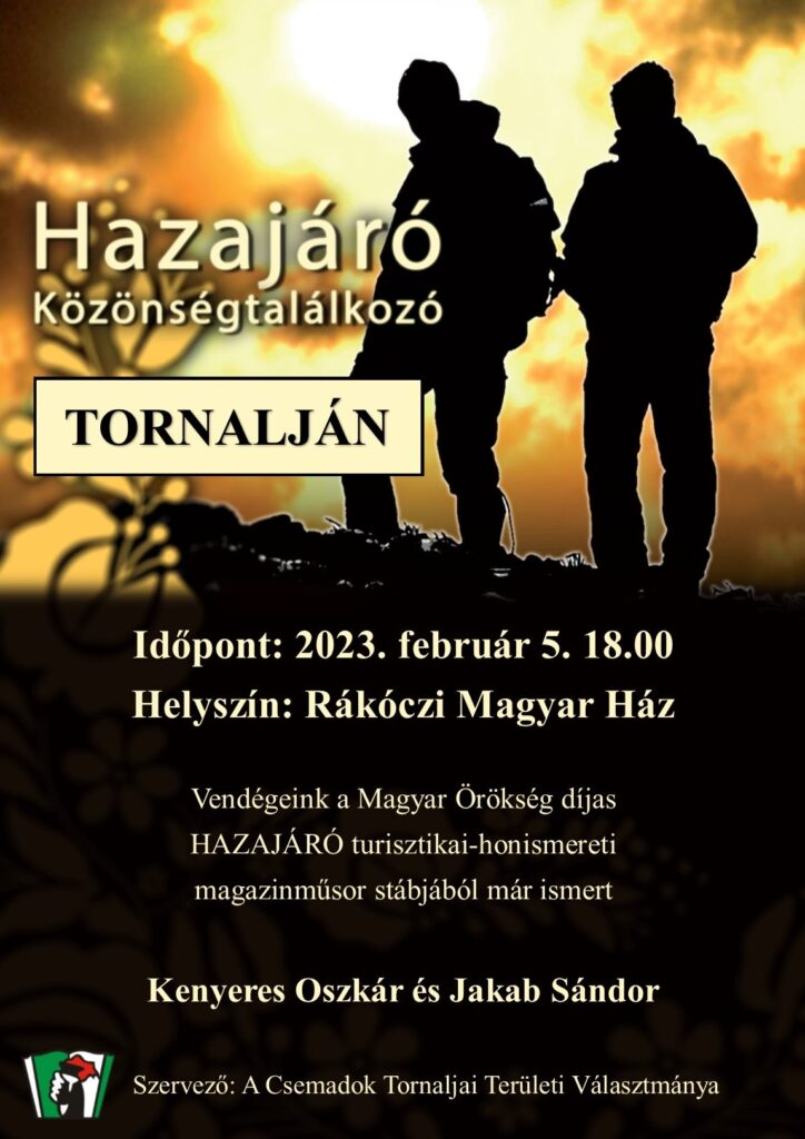 A Csemadok Tornaljai Területi Választmánya nagy szeretettel meghív Mindenkit a Hazajáró közönségtalálkozóra, amire 2023 február 5-én (vasárnap) 18:00 órakor kerül sor a tornalja Rákóczi Magyar Házban.