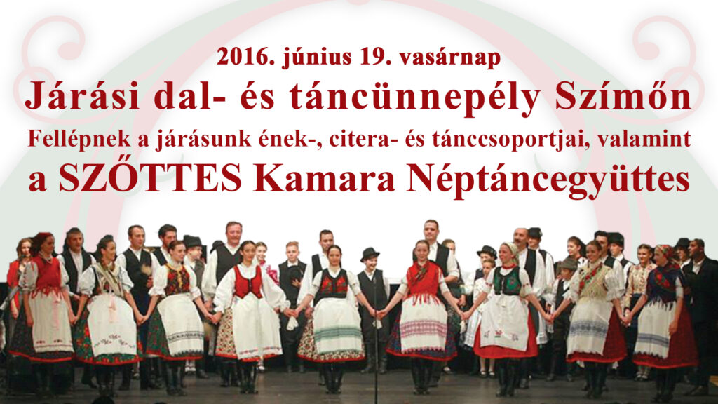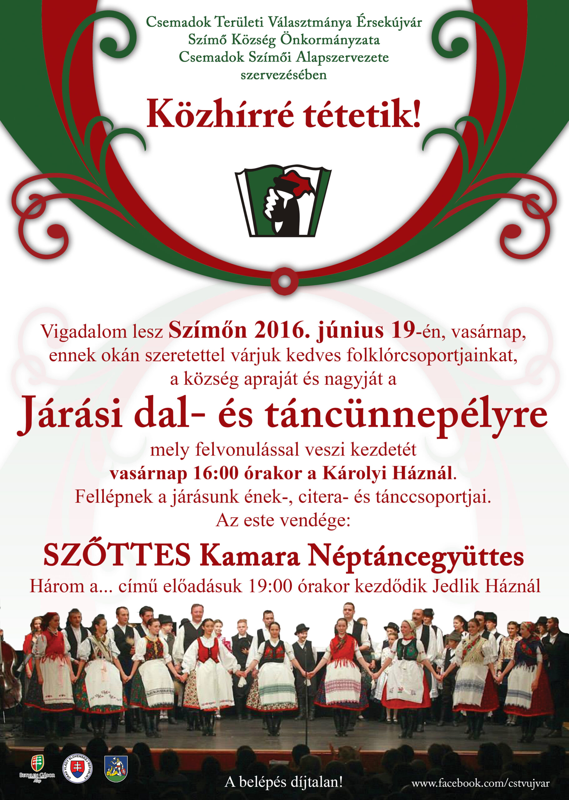 Vigadalom lesz Szímőn 2016. június 19-én, vasárnap, ennek okán szeretettel várjuk kedves folklórcsoportjainkat, a község apraját és nagyját a Járási dal- és táncünnepélyre, mely 16 órakor veszi kezdetét Szímőn a Károlyi Háznál. Fellépnek járásunk ének-, citera- és tánccsoportjai. Az est vendége a FÁBRY ZOLTÁN DÍJAS, és A SZLOVÁK KÖZTÁRSASÁG EZÜSTPLAKETTJÉVEL KITÜNTETETT, SZŐTTES Kamara Néptáncegyüttes. Három a… c. előadásuk 19 órakor kezdődik a Jedlik Háznál.