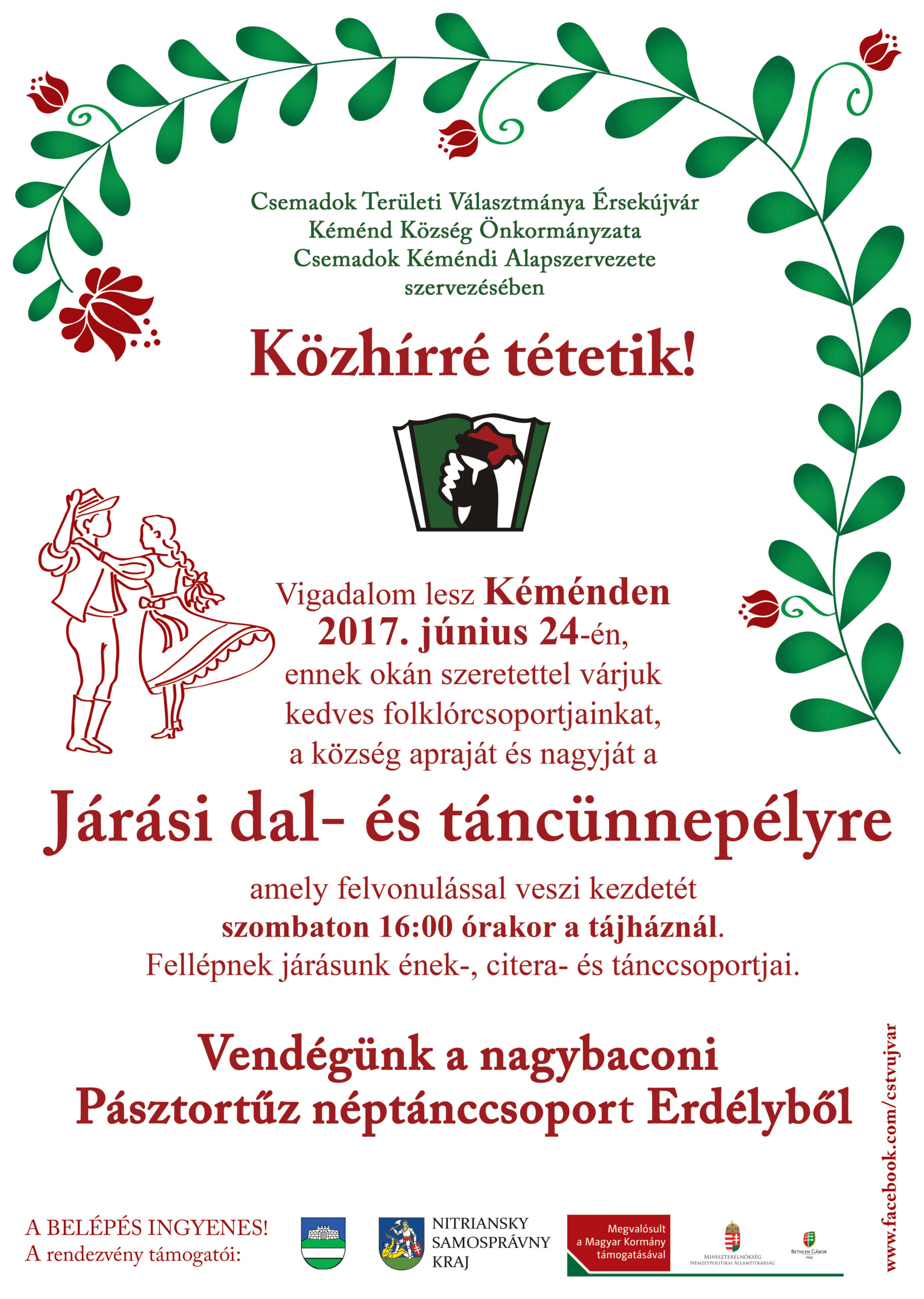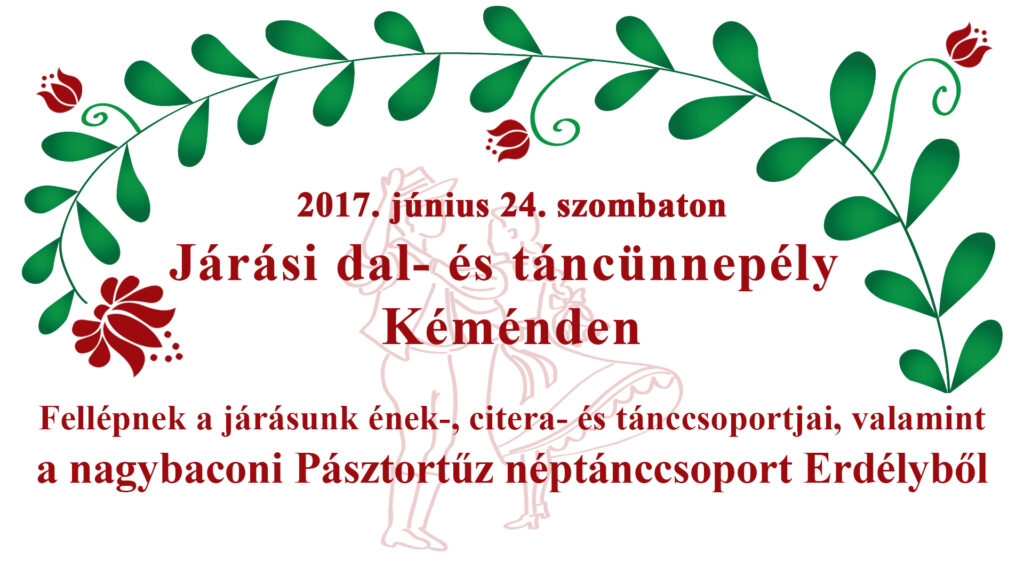 Vigadalom lesz Kéménden 2017. június 24-én, szombaton, ennek okán szeretettel várjuk kedves folklórcsoportjainkat, a község apraját és nagyját a Járási dal- és táncünnepélyre, mely 16 órakor veszi kezdetét Kéménden a tájháznál. Fellépnek járásunk ének-, citera- és tánccsoportjai. Az est vendége a nagybaconi Pásztortűz néptánccsoport Erdélyből.