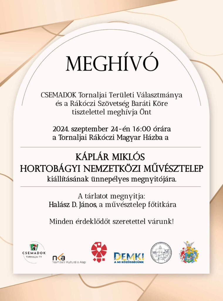 A CSEMADOK Tornaljai Területi Választmánya és a Rákóczi Szövetség Baráti Köre tisztelettel meghívja Önt 2024. szeptember 24-én (kedd) 16:00 órára Tornaljai Rákóczi Magyar Házba a Káplár Miklós Hortobágyi Nemzetközi Művésztelep kép és fénykép kiállításának ünnepélyes megnyitására. A tárlatot megnyitja Halász D. János, a DEMKI Debreceni Művelődési Központ és Ifjúsági Házügyvezető igazgatója. Közreműködik: Thuza Gréta (Kazinczy Alapiskola).