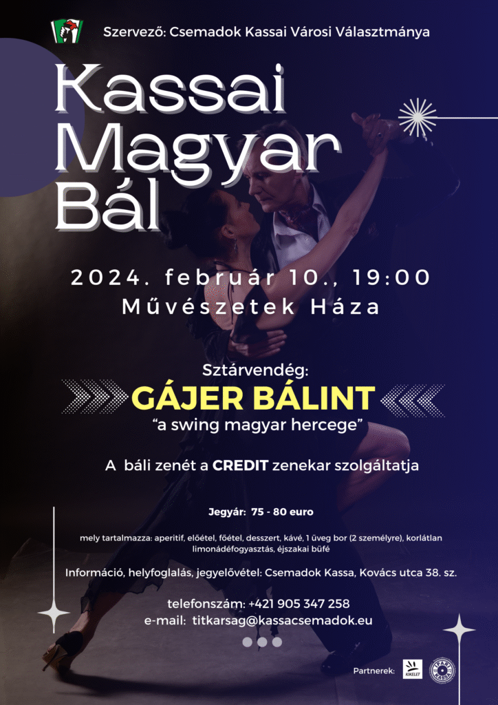 Szeretettel hívjuk Önöket a hagyományos Kassai Magyar Bálba, amelyet 2024. február 10-én szervezünk a Művészetek Házában. A bál sztárvendége a Fonogram díjas Gájer Bálint lesz, a mai magyar „Swing’n Pop” zenei stílus meghonosítója és vezéralakja.
