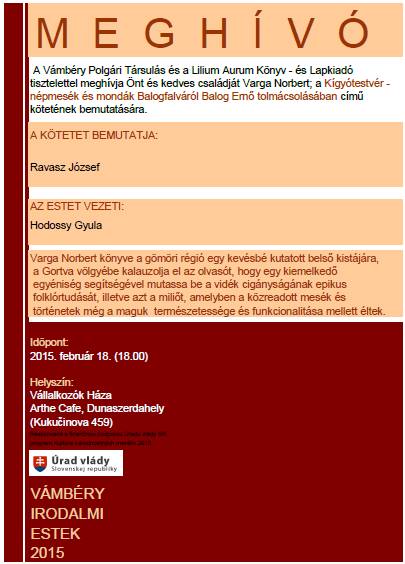 2015. február 18-án, szerdán, 18.00 órakor az Arte Cafeban, Dunaszerdahelyen.