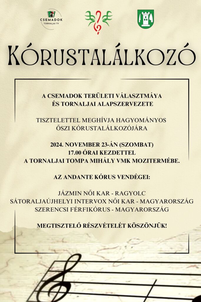 A Csemadok Tornaljai Területi Választmánya és Tornaljai Alapszervezete mindenkit szeretettel meghív hagyományos őszi kórustalálkozójára, amelyre szombaton (november 23-án) 17:00-tól kerül sor a Tornaljai Tompa Mihály VMK-ban.