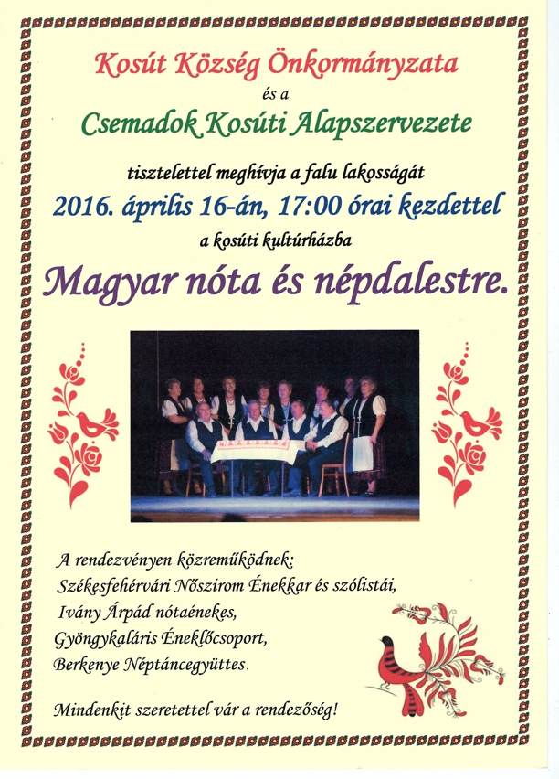 Kosút község Önkormányzata és a Csemadok alapszervezete 2016. április 16-án, 17.00 órai kezdettel a kosúti kultúrházban Magyar nóta és népdalestet szervez.