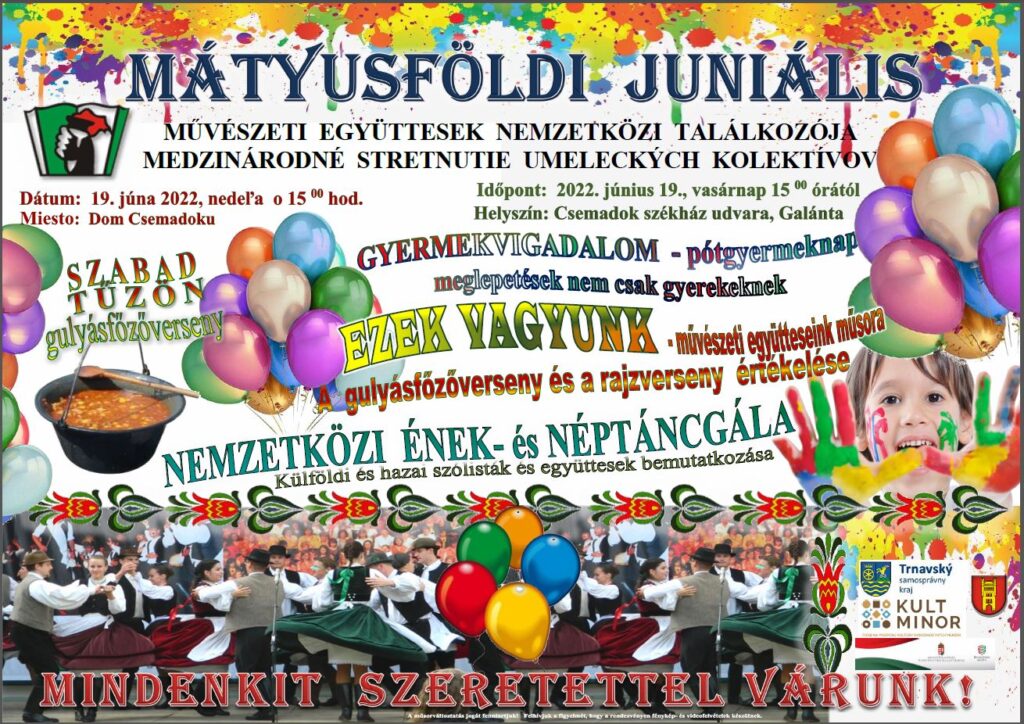 Szeretettel várjuk Önöket a 2022. június 19-én, vasárnap 15.00 órakor Galántán a Csemadok székház udvarán sorra kerülő Mátyusföldi Juniálisra.