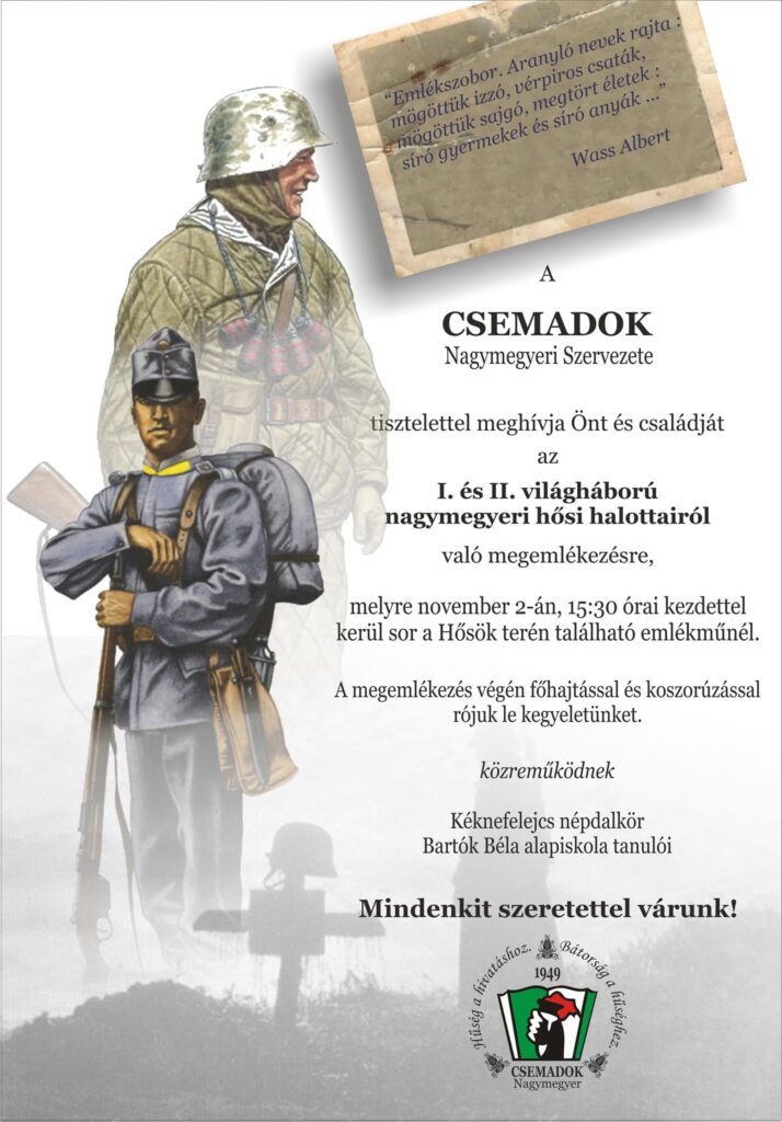 – 2023. november 2-án 15:30 órakor – a háborúkban elhunyt nagymegyeri hősökről való megemlékezésre a Halottak napja alkalmából (bővebben a csatolt meghívóban).