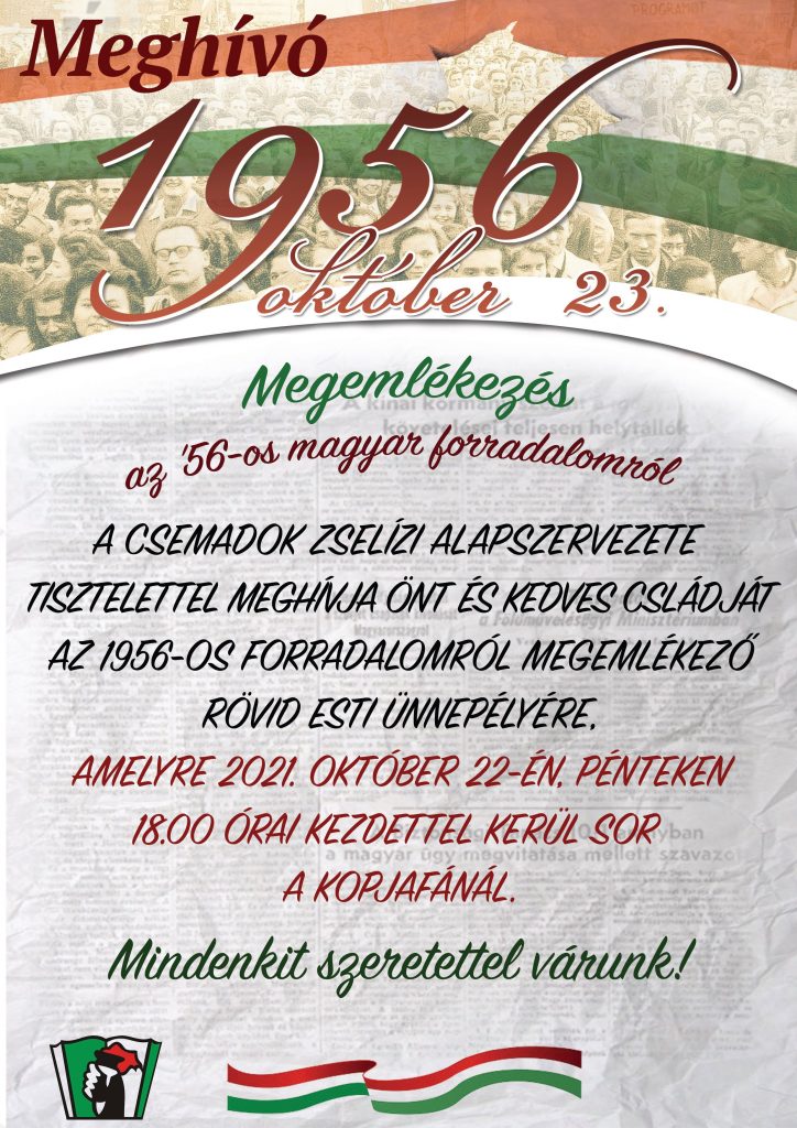 A magyar nép büszkén emlékezik a pesti srácokra, akik 1956-ban azt mondták elég volt a zsarnokságból! Ez alkalomból a Csemadok zselízi Alapszervezete szervezésében idén is fejet hajtunk Zselízen, a Hősök Emlékkertjében az áldozatok emléke előtt. Mindenkit szeretettel várunk a járványügyi szabályozások betartása mellett.