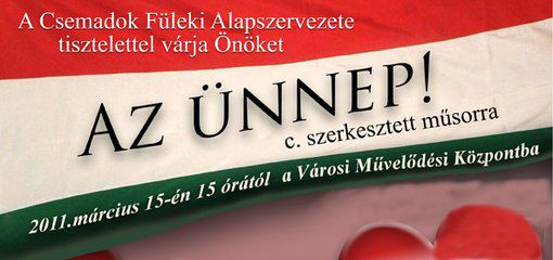 Március 15., vasárnap, 15.00, Városi Művelődési Központ / A Csemadok Füleki Alapszervezete mindenkit szeretettel vár az Ünnep című szerkesztett műsorra.