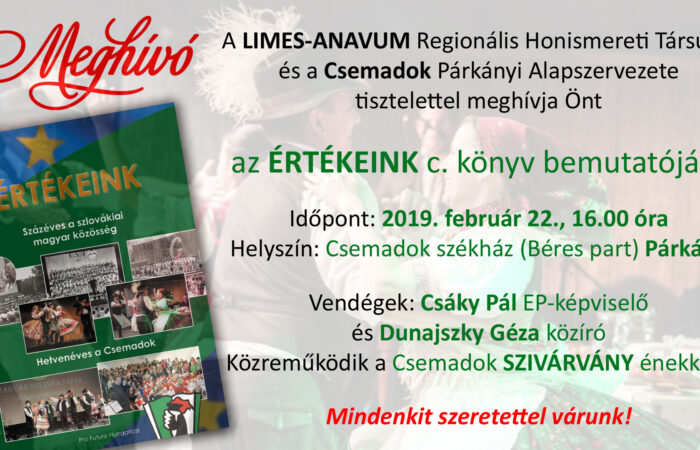 A Limes-Anavum Regionális Honismereti Társulás és a Csemadok Párkányi Alapszervezete tisztelettel meghívja önt az ÉRTÉKEINK c. könyv bemutatójára.
