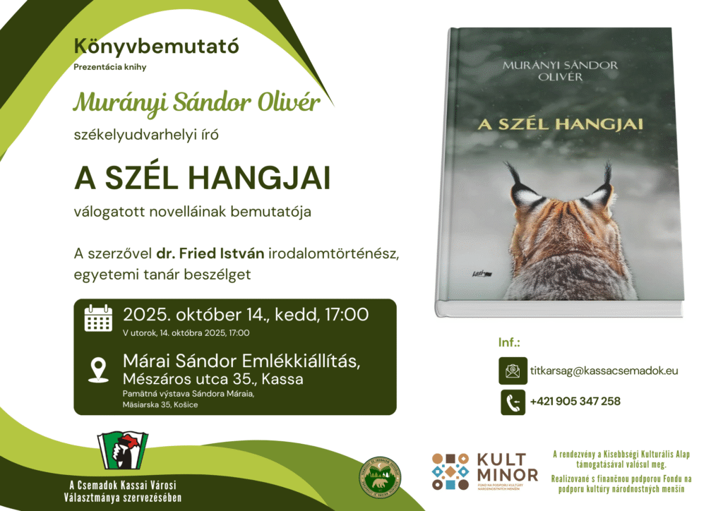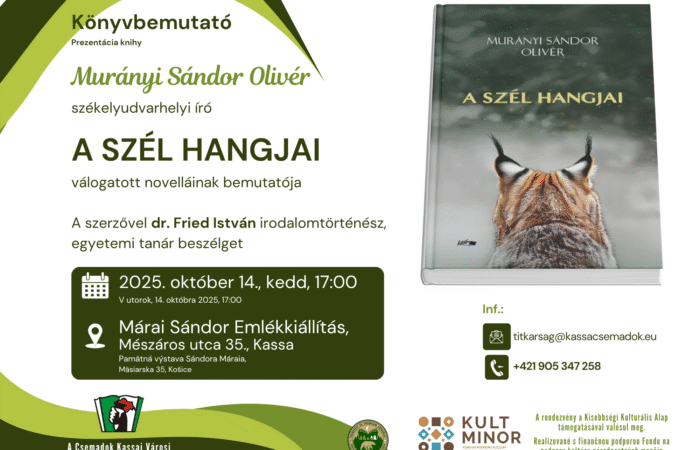Szeretettel hívjuk Önöket 2025. 10. 14-én, kedden, 17:00 órai kezdettel a Márai Sándor Emlékkiállításba Murányi Sándor Olivér székelyudvarhelyi író, A szél hangjai válogatott novelláinak bemutatójára.