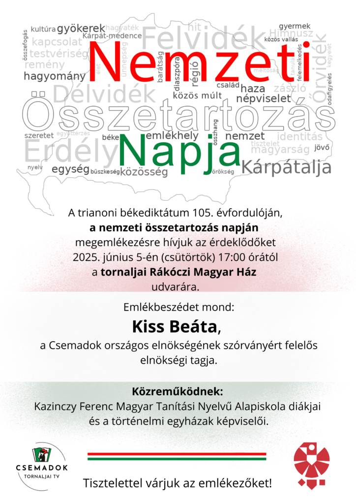 Szeretettel meghívjuk Önöket a trianoni békediktátum 105. évfordulóján, a nemzeti összetartozás napja alkalmából tartandó megemlékezésre, amelyre 2025. június 5-én (csütörtökön) 17:00 órától kerül sor a tornaljai Rákóczi Magyar Ház udvarán.