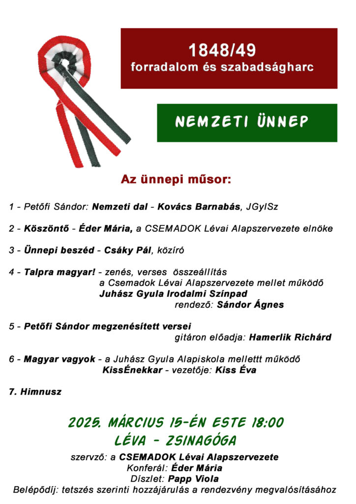 A CSEMADOK Lévai Alapszervezete nevében tisztelettel meghívjuk Önt, kedves családját és barátait Nemzeti Ünnepünk műsorára 2025. március 15-én este 6 órai kezdettel a Zsinagógába. Ünnepeljünk együtt!
