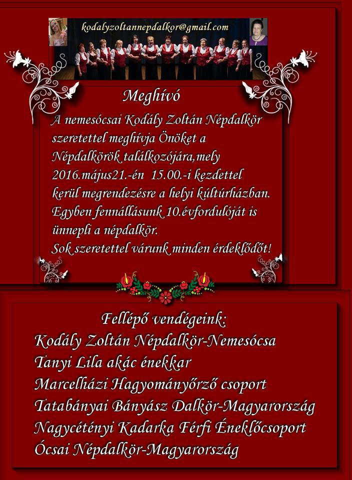 2016. május 21-én 15.00 órakor a kultúrházban, a népdalkör fennállásának 10. évfordulóján.