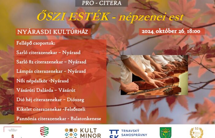 A Pro – Citera polgári társulás meghívja Önt és b. családját a Sarló citerazenekar által szervezett népzenei estre Őszi esték címmel. A népzenei est a nyárasdi kultúrházban 2024. október 26-án 18:00 órai kezdettel kerül megrendezésre.