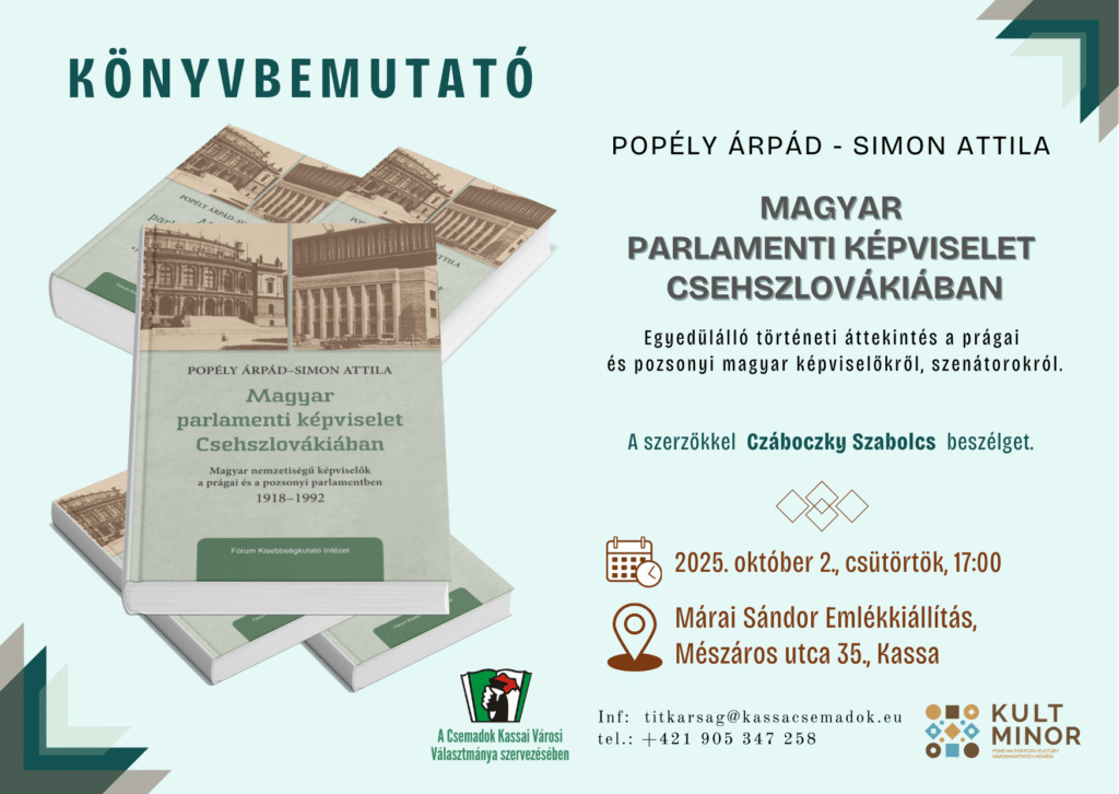 A Csemadok Kassai Városi Választmánya szeretettel meghívja Önt Popély Árpád és Simon Attila:  Magyar palamenti képviselet Csehszlovákiában című új hiánypótló kötetének bemutatójára.