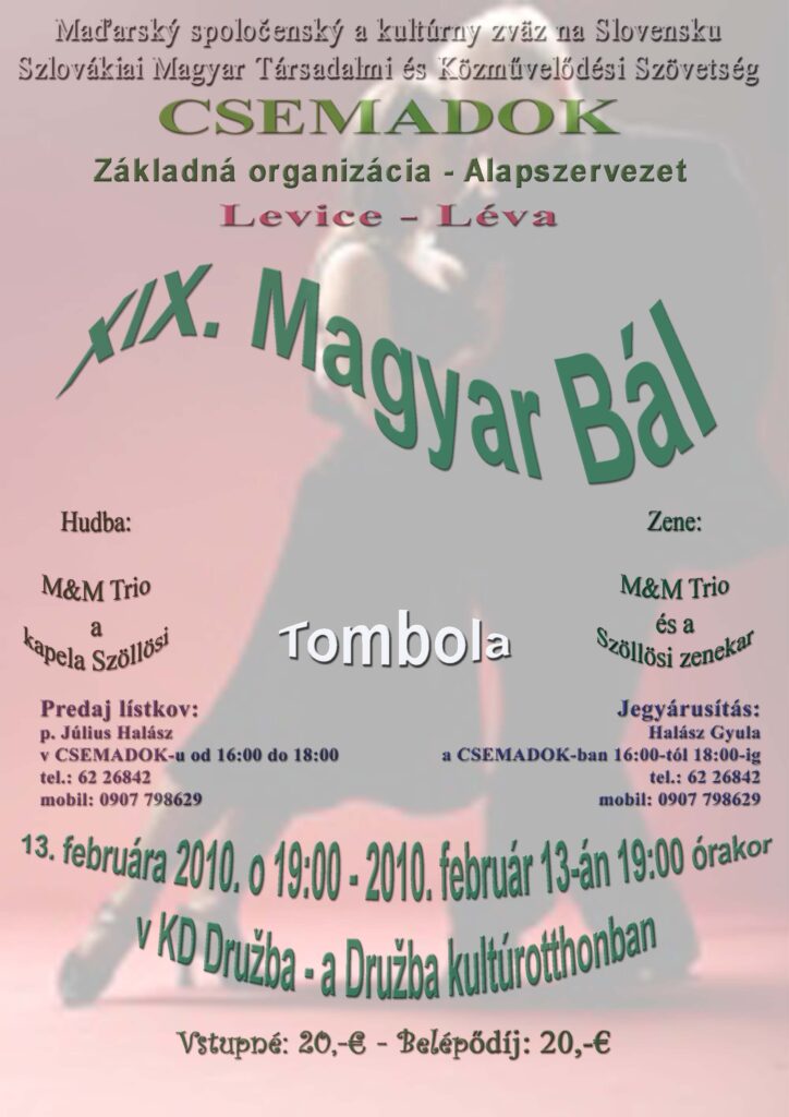 A Csemadok lévai alapszervezete 19. alkalommal rendezi meg hagyományos magyar bálját a Družba kultúrotthonban, 2010. február 13-án.