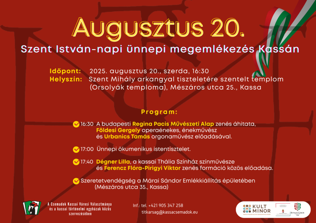 Szeretettel hívjuk Önöket a Csemadok Kassai Városi Választmánya és a történelmi egyházak közös szervezésében sorra kerülő Szent István-napi ünnepi megemlékezésre és istentiszteletre.