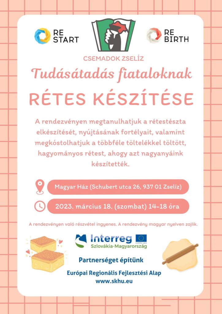 A rendezvényen megtanulhatjuk a rétestészta elkészítését, nyújtásának fortélyait, valamint megkóstolhatjuk a többféle töltelékkel töltött, hagyományos rétest, ahogy azt nagyanyáink készítették.