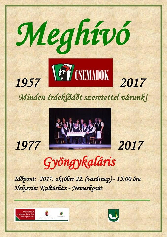 2017. október 22-én ünnepli a Csemadok Kosúti Alapszervezete fennállása 60., a Gyöngykaláris éneklőcsoport pedig 40. évfordulóját ünnepli. A kettős évforduló ünnepi programja a kosúti kultúrházban valósul meg, 15 órai kezdettel.