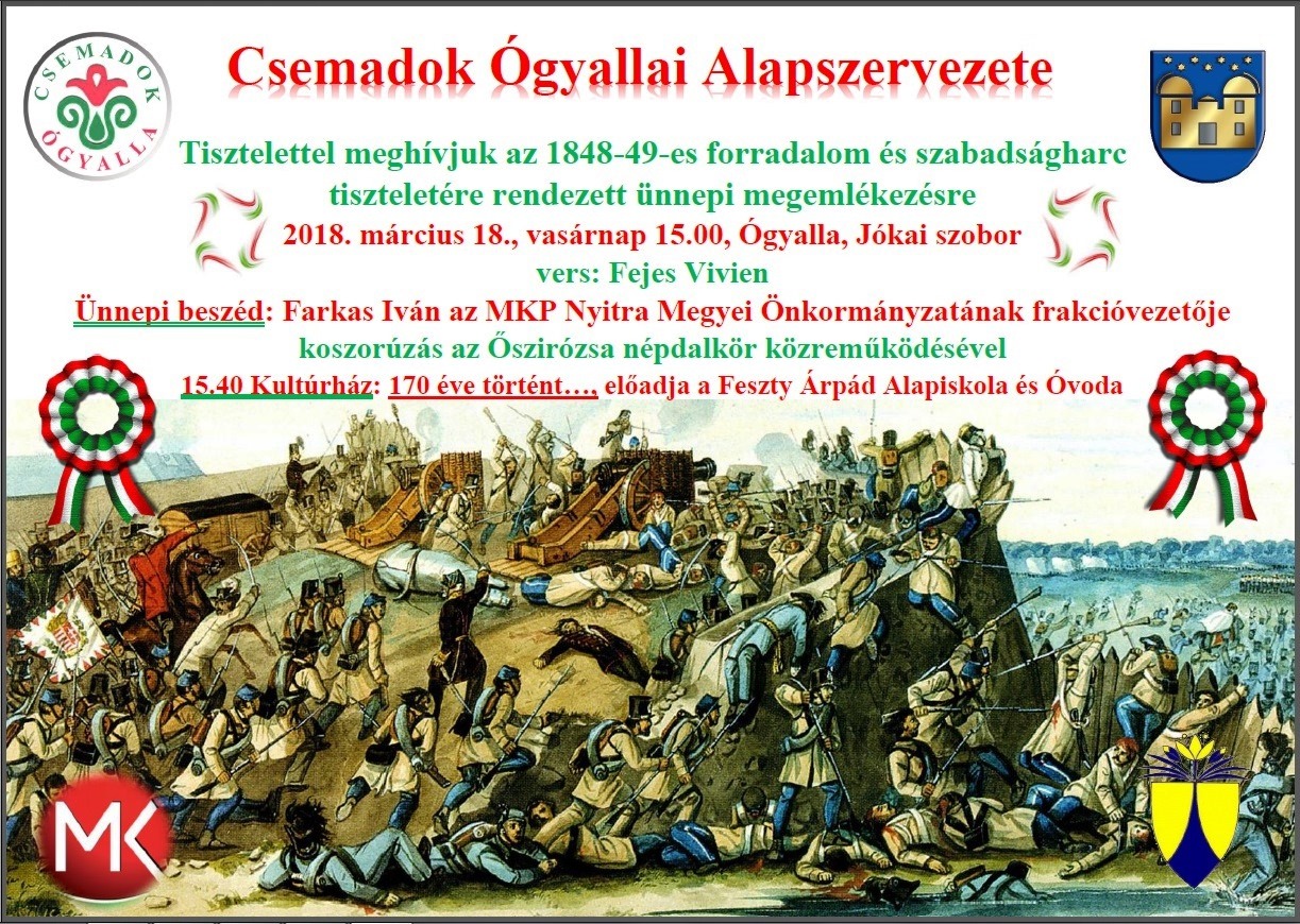 Tisztelettel meghívjuk az 1848/49-es forradalom és szabadságharc 170. évfordulója tiszteletére rendezett ünnepi megemlékezésre és koszorúzásra Ógyallán, 2018. március 18-án, 15 órakor a Jókai szoborhoz, majd az ünnepi műsorra a kultúrházba.