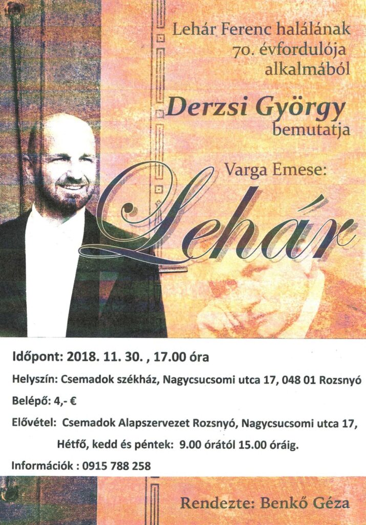Az előadásban felhangzó gyönyörű Lehár operetta részleteket Derzsi György előadásában hallhatják, aki már a Szerelmem, Sárdy című előadásával is elvarázsolta a közönséget.