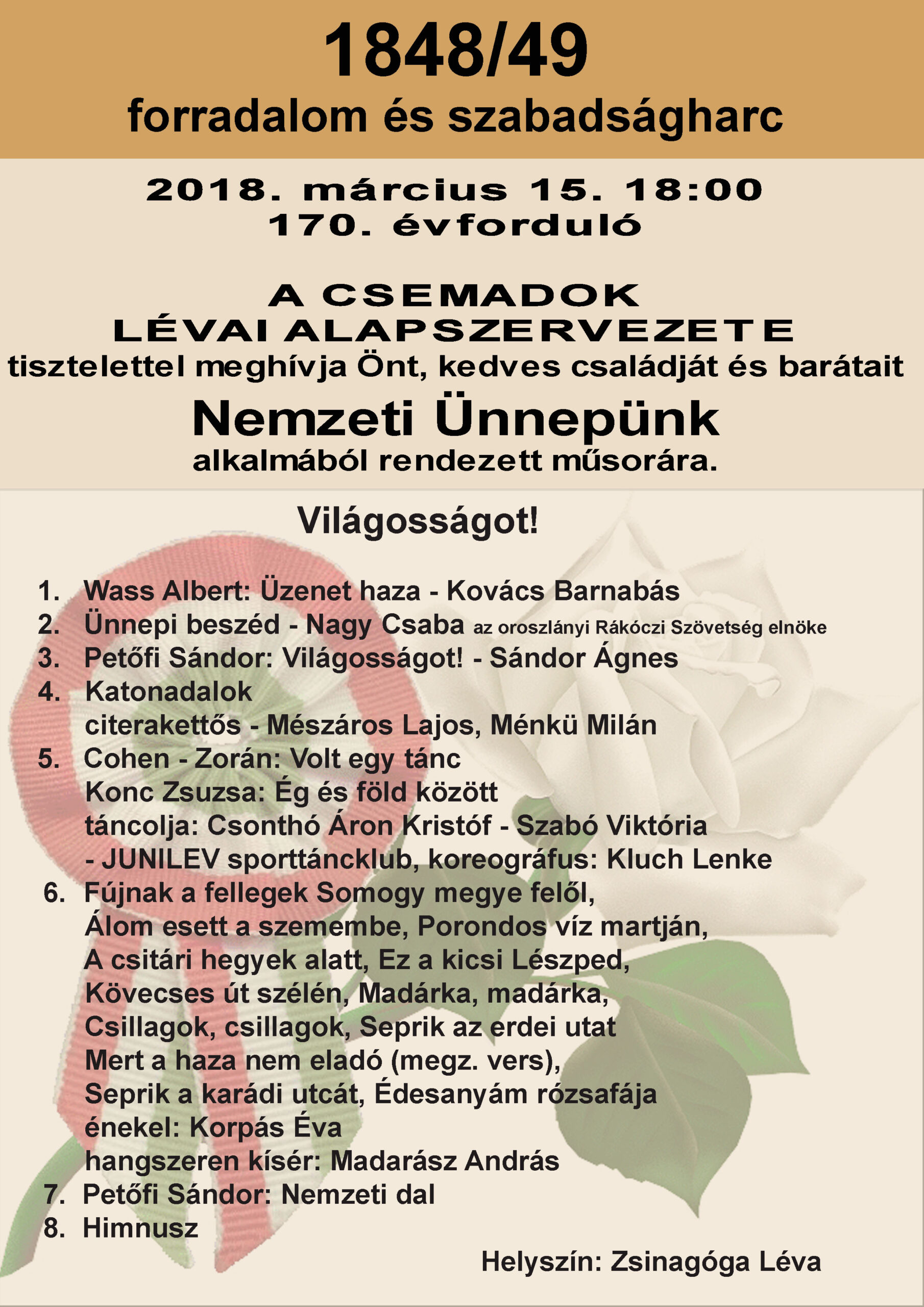 A Csemadok Lévai Alapszervezete tisztelettel meghívja Önt, kedves családját és barátait 2018. március 15-én, csütörtökön, 16 óra 30 perces kezdettel Nemzeti Ünnepünk alkalmából rendezett koszorúzással egybekötött megemlékezésre a lévai temetőben, majd 18 órakor Világosságot! című ünnepi műsorunkra. Ünnepi beszédet V. Nagy Csaba az oroszlányi Rákóczi Szövetség elnöke mond. Az ünnepi műsor szereplői: Kovács Barnabás, Mészáros Lajos – Ménkü Milán, Csonthó Áron Kristóf – Szabó Viktória, Korpás Éva – Madarász András valamint Sándor Ágnes.