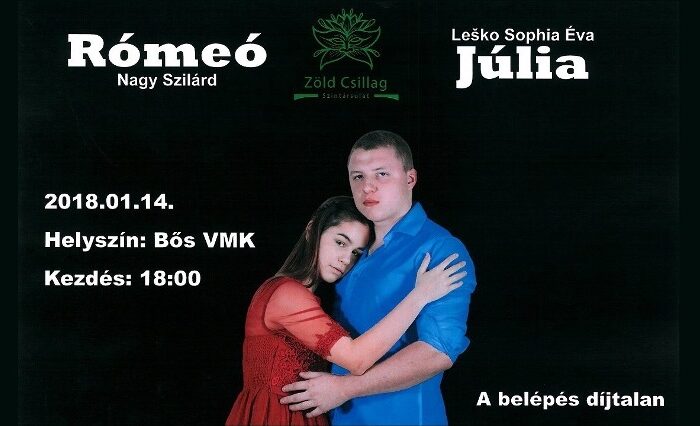 A Bősi Csemadok Alapszervezet támogatásával bősi és környékbeli fiatalok a közelmúltban létrehozták a Zöld Csillag Színjátszótársulatot. A színtársulat próbáinak első gyümölcse a Rómeó és Júlia musical részleteinek feldolgozása, melynek bemutatójára 2018. január 14-én, 18 órától kerül sor a bősi kultúrházban. A belépés díjtalan. Mindenkit szeretettel várnak a szervezők.