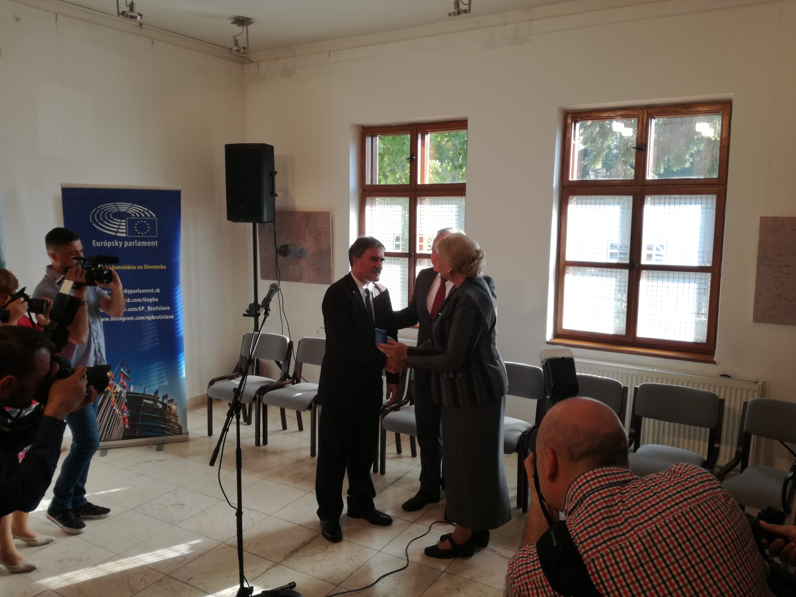 Csáky Pál EP képviselő és Dyoníz Hochel, az Európai Parlament Szlovákiai Tájékoztatási Irodájának képviselője adják át Bárdos Gyulának, a Csemadok országos elnökének az Európai Polgári Díjat.