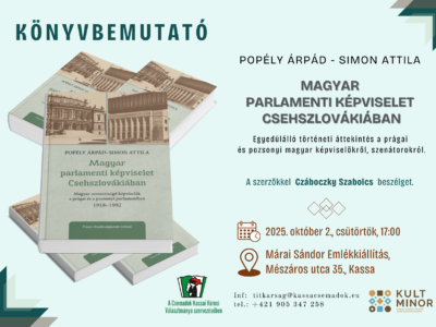 A Csemadok Kassai Városi Választmánya szeretettel meghívja Önt Popély Árpád és Simon Attila: Magyar palamenti képviselet Csehszlovákiában című új hiánypótló kötetének bemutatójára. Magyar nemzetiségű képviselők a prágai és a pozsonyi parlamentben 1918–1992:... Bővebben