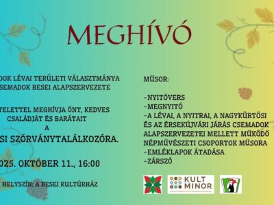 A CSEMADOK Tornaljai Területi Választmánya, a Rákóczi Szövetség helyi szervezete és Tornalja Város Önkormányzata MEGHÍVÓ A tornaljai városnapok keretében, az aradi vértanúk napja alkalmából ünnepi megemlékezést rendeznek 2025. október 6-án... Bővebben