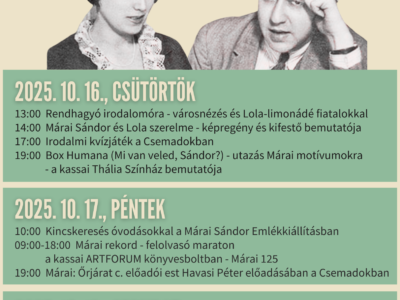 Sok szeretettel várunk mindenkit immár a második Márai-Lola Napokon, október 16-18-ig! Akárcsak tavaly, az idén is sok-sok színes programmal készülünk, amelyek témái szintén szorosan kapcsolódnak Kassa világhírű szülötte, Márai Sándor és felesége,... Bővebben