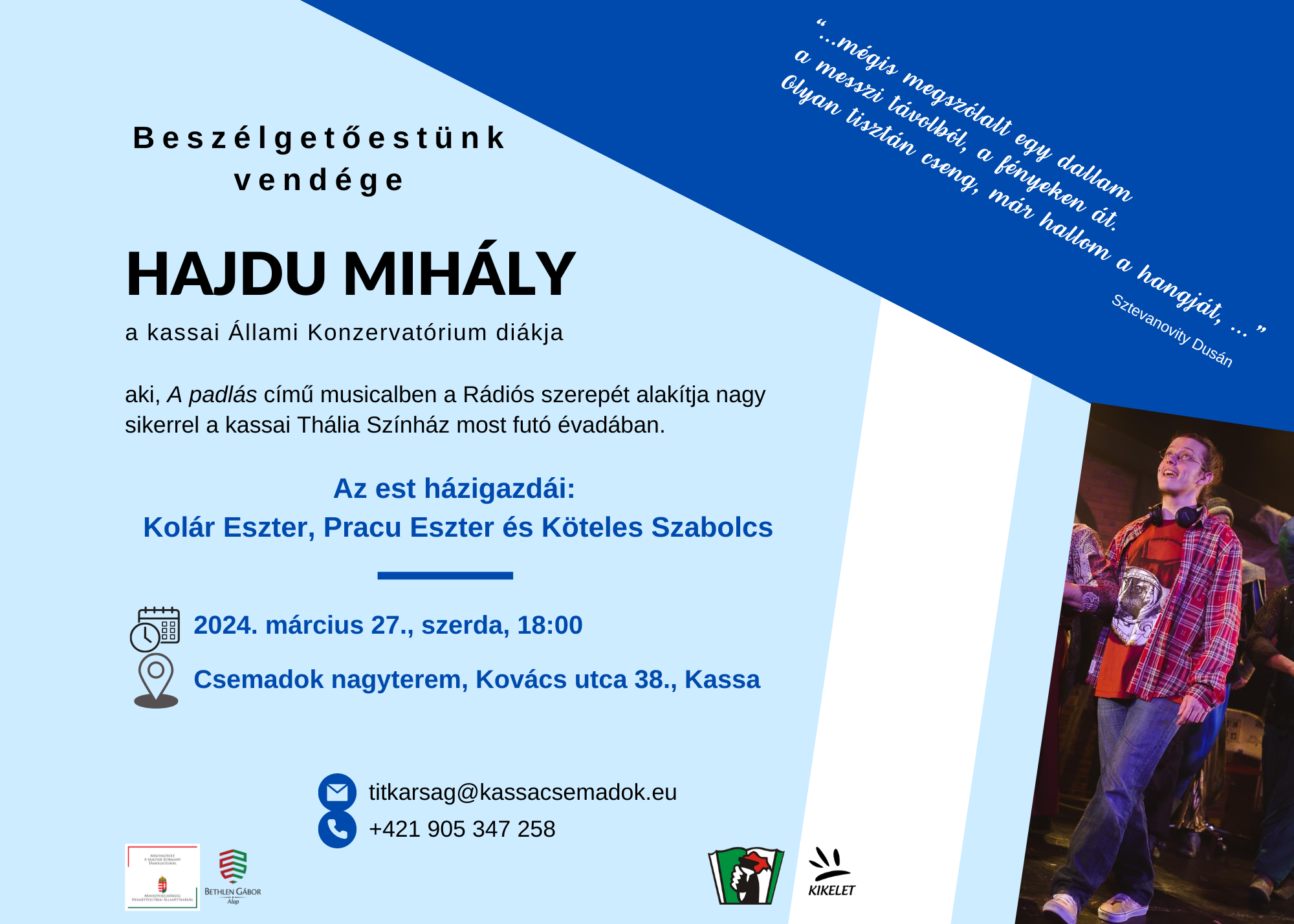 | Vendég: | Hajdu Mihály, aki A Padlás c. musicalben a Rádiós szerepét alakítja a kassai Thália színház most futó évadában. | ||||