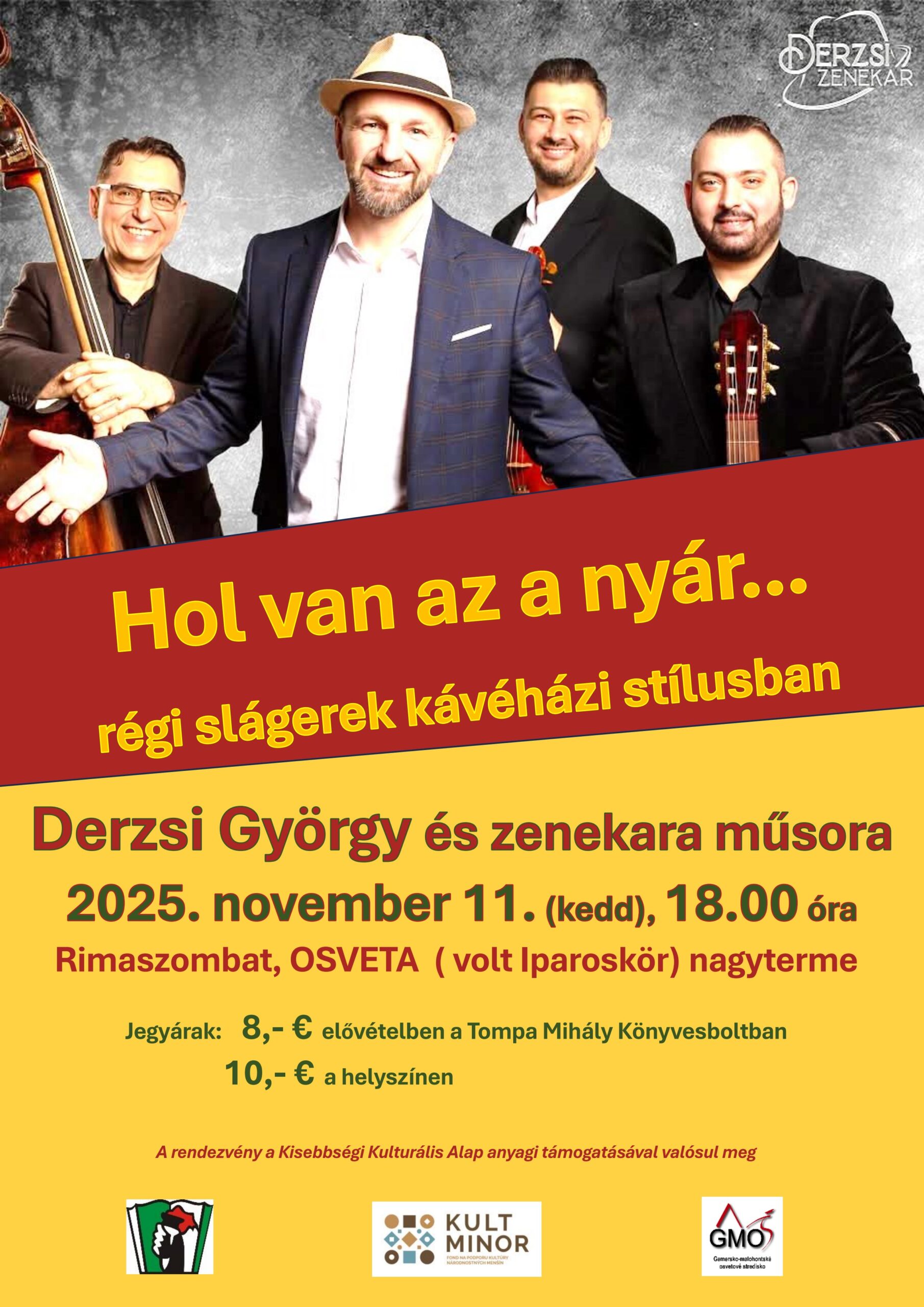 A Csemadok Rimaszombati Területi Választmánya szeretettel hívja az érdeklődőket Derzsi György és zenekara „Hol van az a nyár “ című műsorára, amely a XXII. Győry Dezső Kulturális Napok keretében valósul meg 2025. november 11-én, 18:00 órai kezdettel Rimaszombatban az Osveta (volt Iparoskör) nagytermében.