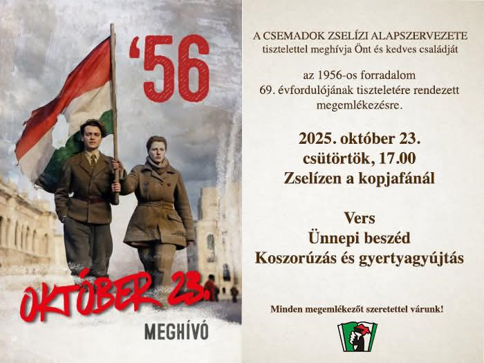 A Csemadok Zselízi Alapszervezete tisztelettel meghív minden érdeklődőt az 1956-os magyar forradalom megemlékezésre, amelyet október 23-án, csütörtökön tartanak 17:00 órától a kopjafánál.