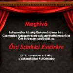 2015. november 6-7-én a kultúrházban / rendező: Lakszakállas község Önkormányzata és a Csemadok Alapszervezete november 6., péntek 16.30 Noé barkája című színdarab az Ekecsi Szociális Otthon Szlvárvóny színjátszó csoport előadása […]
