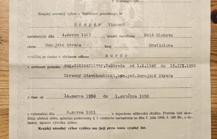 Gáspár Vince – bizonyítvány és szakmunkáslevél 1951