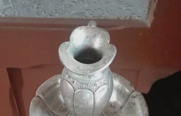 Keresztelő kancsó ezüst, domború díszítéssel. Kerek, domború talpból emelkedik az alul gyűrűs, tojásdad test, vállán törésvonalas sáv. Nyaka széles, felívelő,...
