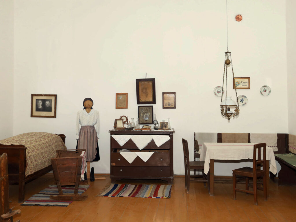 A múzeum nagyterme a régi házbelsőt hivatott bemutatni. A terem a háromosztatú lakóteret rekonstruálja. Mivel a falu lakosságának egy része katolikus, a másik része református volt, így az ,,èső ház” a katolikus hagyományokat, a ,,hátúsó ház” a református hagyományokat tükrözi. Az ,,èső ház” berendezése a régi hagyományt követi, így a két ágy egymás végében van elhelyezve. Az asszony ágya fölé Szűz Mária képe, a férfi ágya fölé Krisztus képe került. Mindkét ágy magasra van felvetve. A háromfiókos sublótban (komód) a szépen összehajtogatott ruhák vannak berakva, legfelső fiókja számtalan fejkendőt, belinerkendőt rejt. A sublót feletti falra elsőáldozási emlékek és szent-képek kerültek. A sublót tetején kegyszobrok, Pietà-szobor, búcsújáróhelyekről származó emlékek, kegytárgyak és a rózsafüzér-gyűjtemény kapott helyet. A mellette lévő szekrénybe került a női viseletek egy része. A szoba közepét faragott lábú asztal foglalja el székekkel, felette díszes lámpa függ. Az asztalon elhelyezett imádságoskönyvek és bibliák bejegyzéseik által egy-egy család életének fontos eseményeit őrzik.