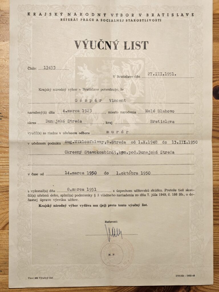 Gáspár Vince – bizonyítvány és szakmunkáslevél 1951
