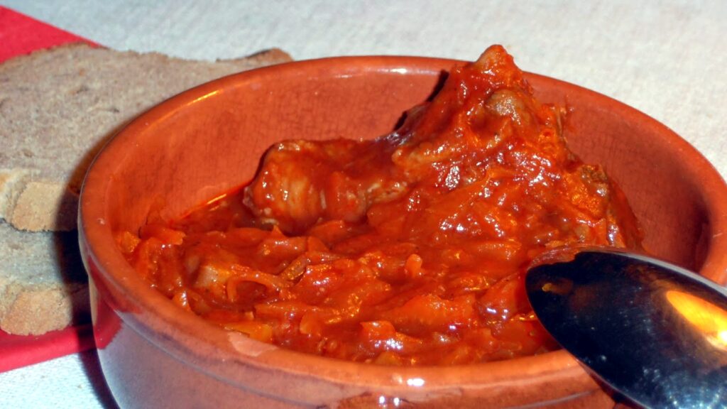 A pörköltben főzzünk egy kisebb csülköt (jobb lesz az íze). Amikor a pörkölt már majdnem készre főtt, hozzáadjuk a káposztát. Mikor a káposzta is megfőtt, elkészítjük a paradicsomszószt. Rántást készítünk, ehhez jön a paradicsomlé, a szószba teszek egy kiskanál őrölt fahéjat, szegfűszeget, vaníliás cukrot, pici sót és készre főzzük.