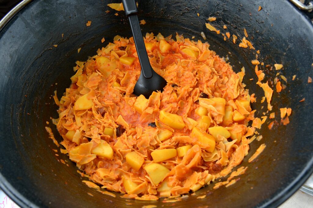 Kockára vágjuk a szalonnát, és bográcsban, lehetőleg gyenge tűzön kiolvasztjuk a zsírját. A tésztát barnára pirítjuk benne, azután hozzáadjuk az apróra vágott vöröshagymát. Miután a hagyma megdinsztelődött, beletesszük a kockára vágott burgonyát és a pirospaprikát. Megsózzuk, és annyi vizet öntünk rá, hogy ellepje. Amikor a levét elfőtte, beleütjük a tojásokat, jól elkeverjük, és összesütjük.