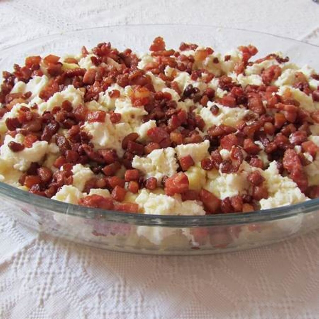 1 kg öreg krumplit nyersen lereszelünk. 1 egész tojásból, kis kanál sóból, féldaralisztből galuskatésztát készítünk. Kicsit pihentetjük, majd a forrásban lévő vízbe szaggatjuk a galuskát. Amint feljön a víz tetejére, kiszedjük. Kb. 15 dkg füstölt szalonnát kis kockákra vágunk, kevés zsíron töpörtyűvé kisütjük, és a kifőtt galuskát a zsírban megforgatjuk. Liptói túróval, tejföllel és szalonnapörcökkel tálaljuk.