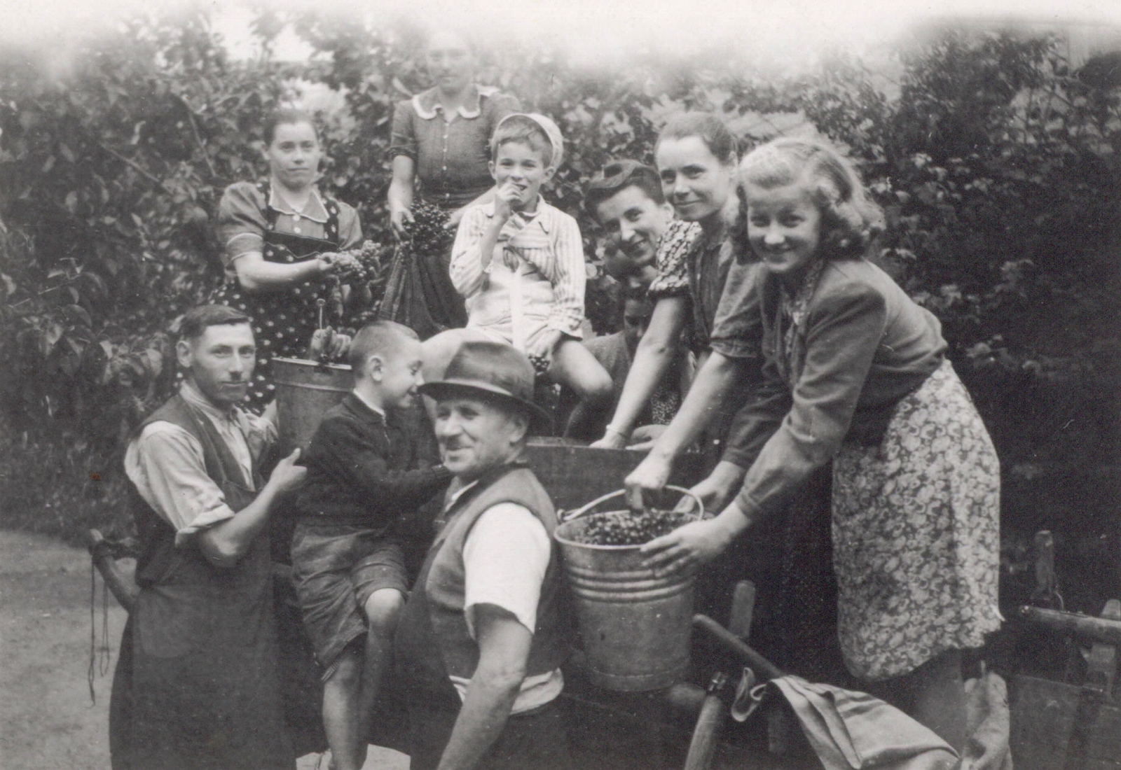 A szüretben részt vett az egész rokonság. Mivel estig is eltartott, a szőlőfődön ebédeltek szalonnát, kolbászt. A legidősebb a családból otthon maradt, ő főzte az ebédet: kacsalevest, sült kacsát. Mikor leszüretelték a szőlőt a szekéren elvitték a borházba. Dédpapámék borháza már akkor a jelenlegi borház-soron volt. Ezek is vályogból épültek, szalma vagy nádtetővel. Egy helyiség volt bennük, itt dolgozták fel a szőlőt. A szekérről megint csak kannák segítségével hordták be a szőlőt a darálóba. Ezután megmérték a cukorfokát.