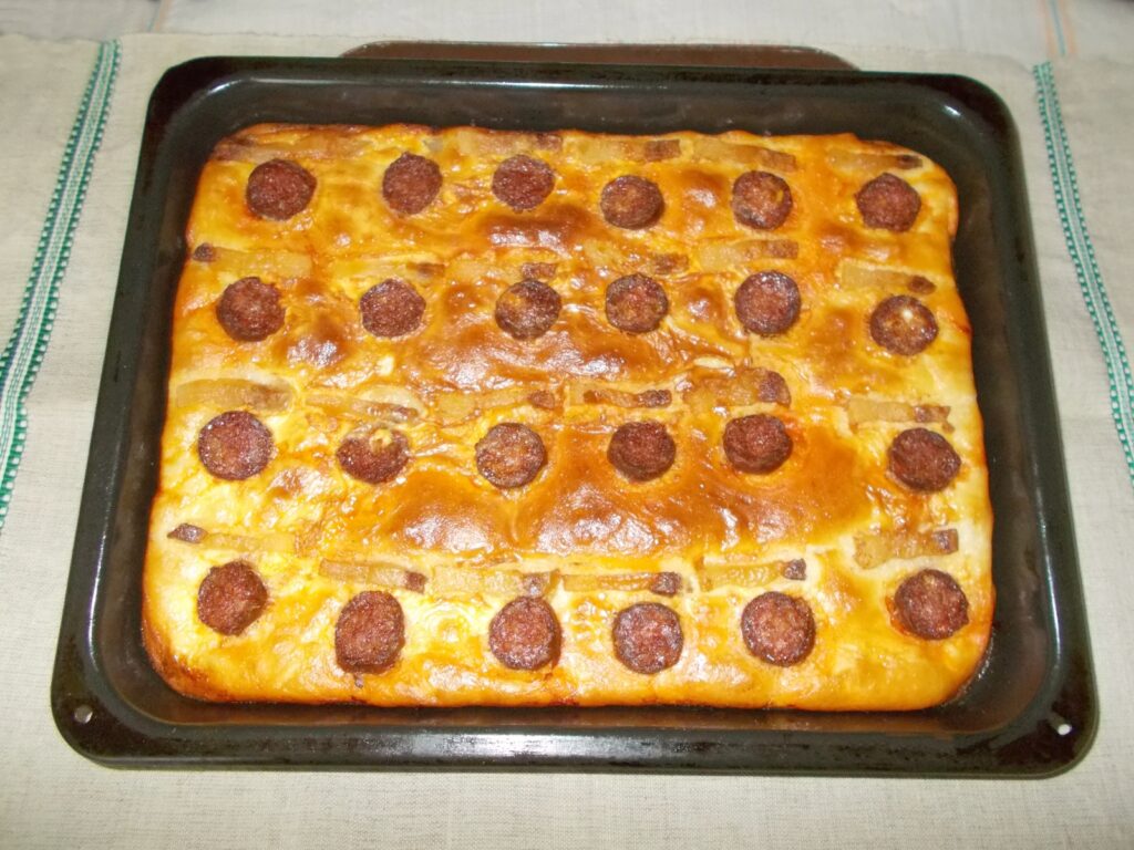 Ha megkelt, kiolajozott pléhre, olajos kézzel egyenletesen szétlapítjuk. Tetejére felkarikázott füstölt kolbászt, minden kolbász mellé közvetlenül egy ujjnyi füstölt szalonna darabot teszünk (6×4 db).