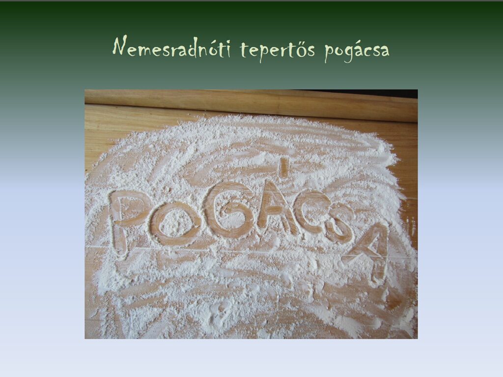 A nemesradnóti tepertős (kilenclyukú, réteges) pogácsa receptjét Lukács Pálné Pósa Katalintól jegyezte le unokája, Gyurán Ágnes 1985-ben. A recept tartozéka, hogy a pogácsakészítő inas lássa az elkészítés folyamatát, és ki bírja várni a tészta pihentetési idejét. A pogácsa különlegessége, hogy kilenclyukú. Ez azt jelenti, hogy háromágú villával a kiszaggatott és megsodrott pogácsákat háromszor meg kell jó mélyen bökni. Így alakul ki a pogácsa tetején a kilenc nyílás, ami a gőz elpárolgására szolgál a nehéz zsíros tésztából. A bátkai értékőrzők legkisebb csoportja (Bátkai Alapiskola, 3.A) Gregor Andrea osztályfőnök vezetésével a Szlovákiai Magyar Pedagógusok Szövetsége Rimaszombati Regionális Központja által meghirdetett projektre készülve szánták el magukat a pogácsa elkészítésére. A sütés során találkozott a régi recept a jövő generációjával, akiknek nagyon tetszett az íze és az illata is. Ennek az értéknek így lett közössége!