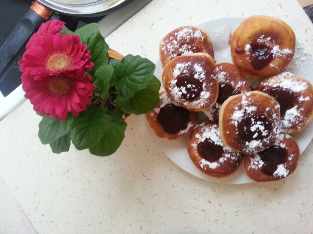 Bőséges zsírt forrósítottunk, a fánkokat középen kissé benyomtuk, és kis adagokban kisütöttük.