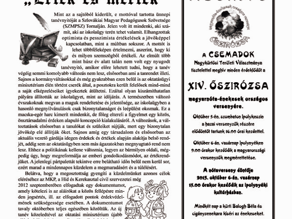 II. évfolyam 9. szám Közéleti havilap. Kiadja a Csemadok Nagykürtösi Területi Választmánya. Nyomda: Pekel Print s.r.o. Bratislava. Terjeszti: a Csemadok...